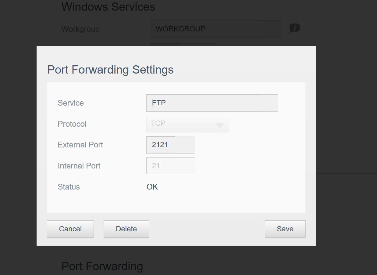 If I’m not mistaking, maybe in Dlink routers the internal and external ports are in the virtual server page? There are Public and Private ports. I’m thinking that might be the page I’m looking for. I added the 2121 as public and 21 as private and IP address is the NAS address.